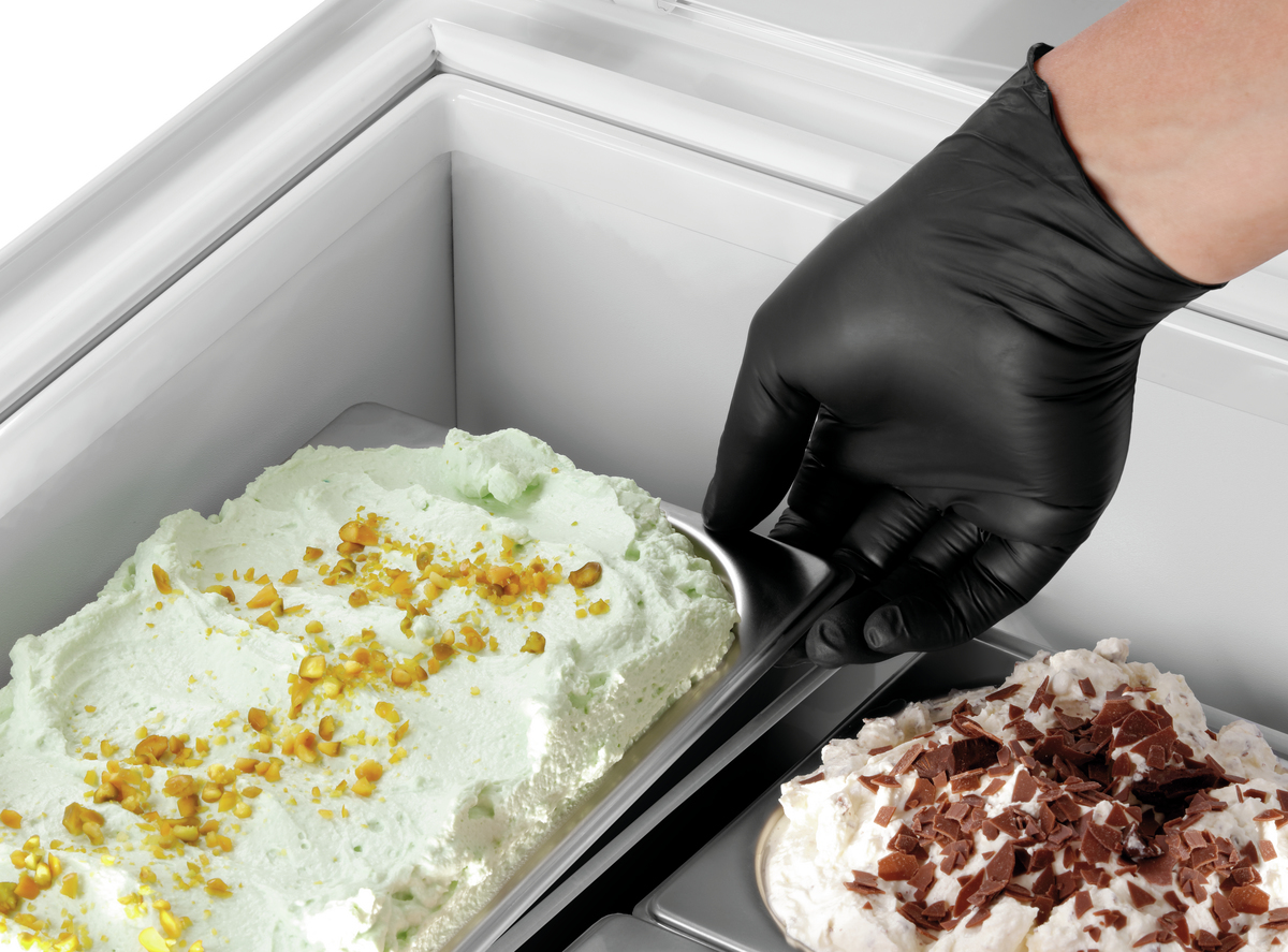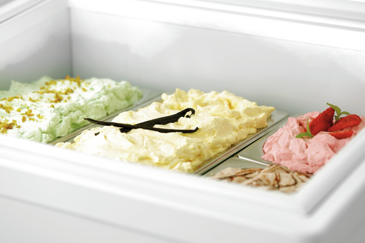 Optimale Aufbewahrung für selbstkreiertes Speiseeis – die Eisvitrine 3x5L-F bietet die Lösung um Desserts nach der Herstellung repräsentativ kühl zu halten. Dank der tiefliegenden Behälter wird das Vereisen der Oberflächen minimiert.