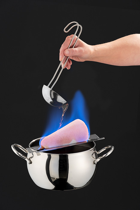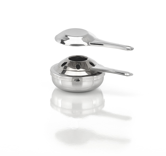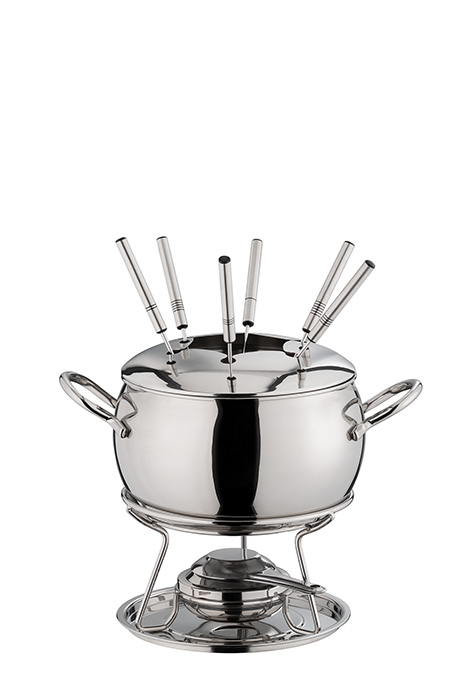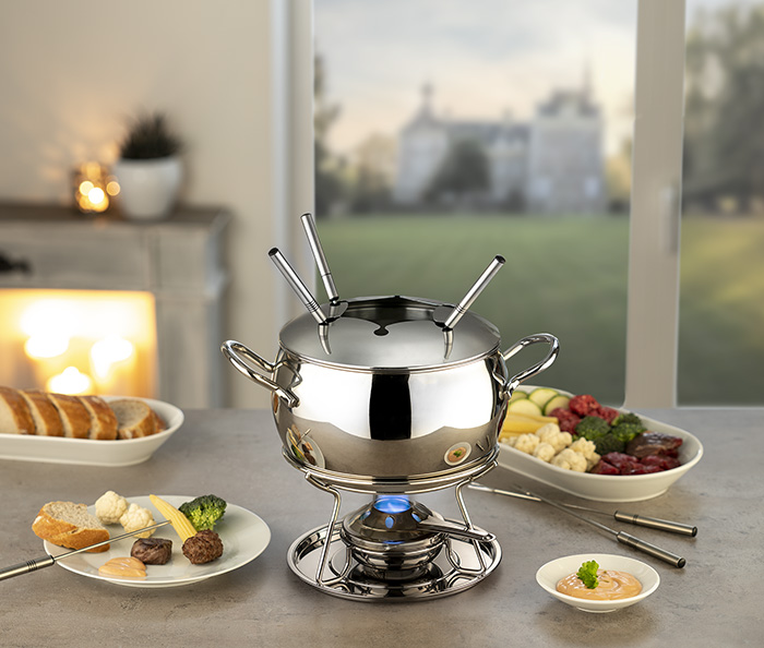 Edelstahl, Polypropylen, 13- teiliges Set:, - 1 Topf, - 1 Fonduedeckel, 1 Topfdeckel, - 1 Gestell, - 1 Schöpfkelle, 1 Feuerzange, - 1 Brennpastenbehälter, - 6 Raclette- und Fonduegabeln