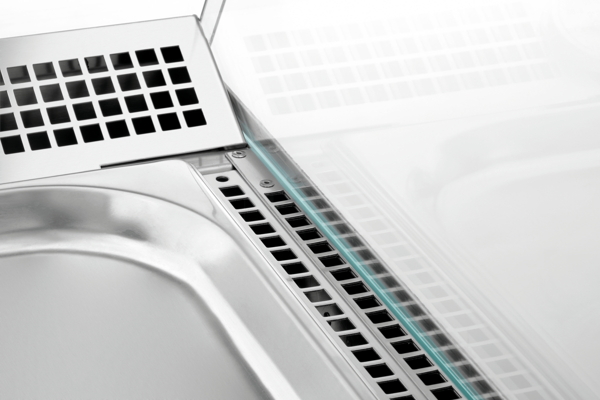 Zubereitete Speisen werden dank der hochwertigen Ausführung und Innenbeleuchtung bei der Speisenausgabe perfekt in Szene gesetzt. Die individuelle Bestückung von bis zu 1 x 1/1 GN und die Zwischenablage bieten bedarfsgerechte Nutzungsmöglichkeiten der heißen Theke. Für eine einfache Reinigung sorgen die abklappbare Frontscheibe und die herausnehmbare Abtropfschublade
