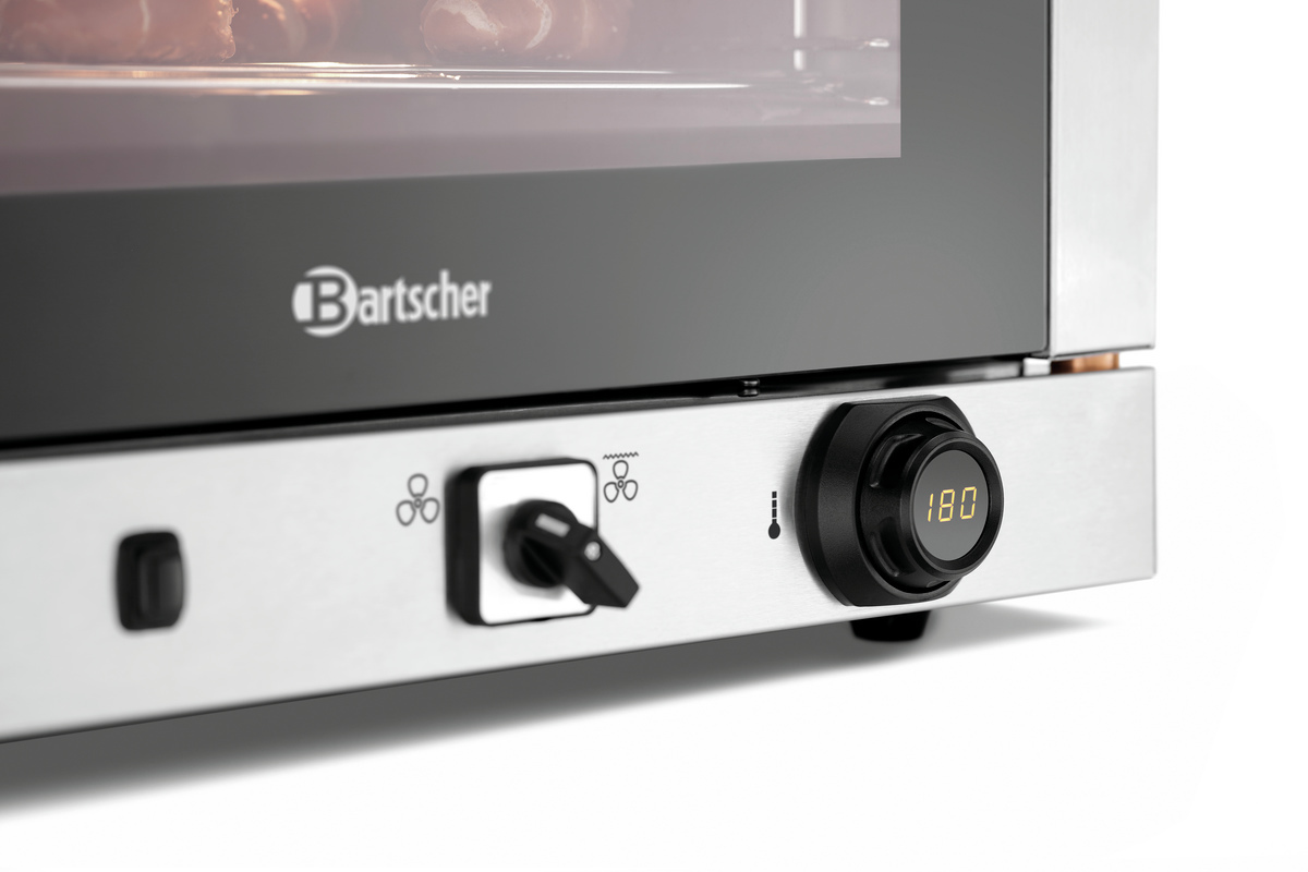 Der AT230-MDI vereinfacht das Bestücken der Backkammer dank des seitlichen Türanschlages. Durch das Vereinen der bewährten AT Features mit der zusätzlichen Grillfunktion und Beschwadung, bleiben hier keine Wünsche offen. Für höchsten Bedienkomfort sorgt die digitale Bartscher MDI-Steuerung mit einer schnellen und unkomplizierten Regulierung von Temperatur und Zeit.