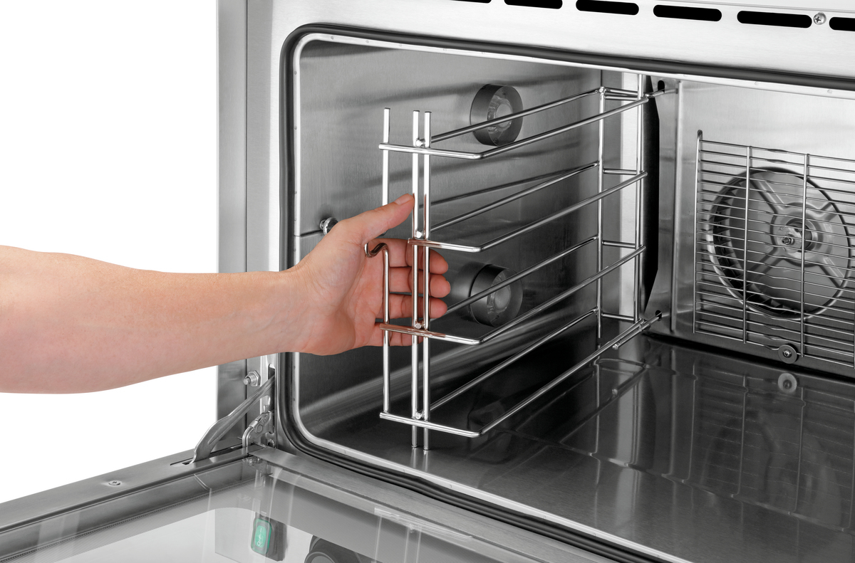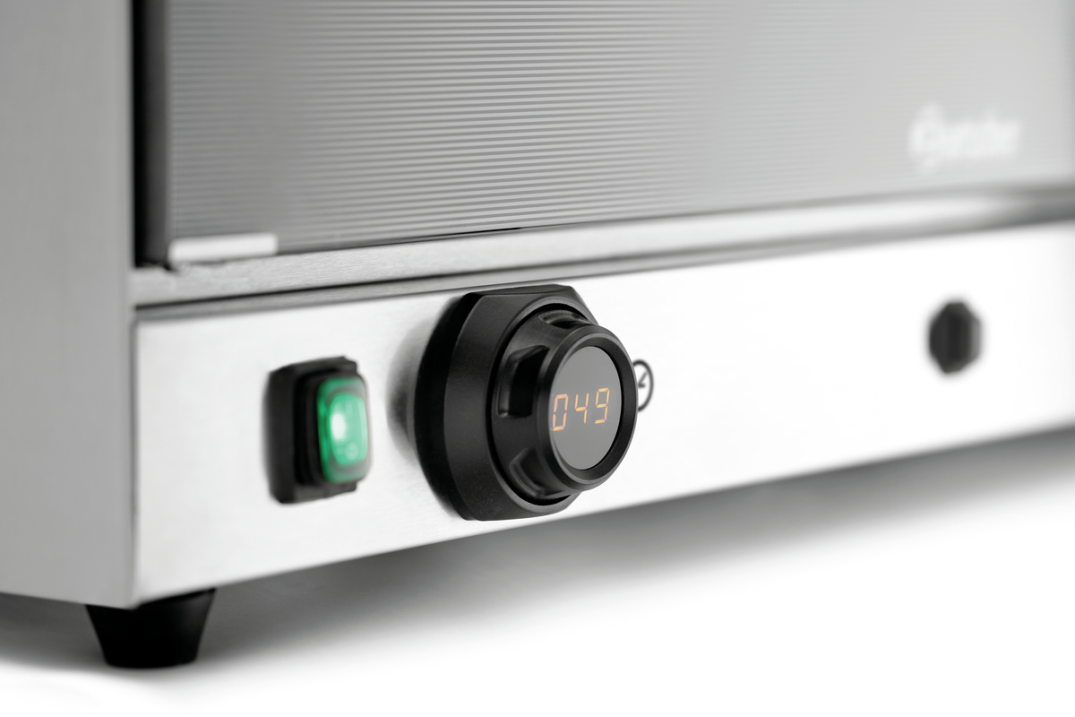 Eigenschaften | Abgerundete Backkammer ,Auflageschienen herausnehmbar ,Doppeltürverglasung ,Knebel mit Digital-Anzeige für Temperatur und Zeit ,Memory-Funktion ,Mögliche Pausierung des Garprozesses über Temperaturregler ,Signalton nach Ablauf der Zeit (1 - 120 Minuten) |