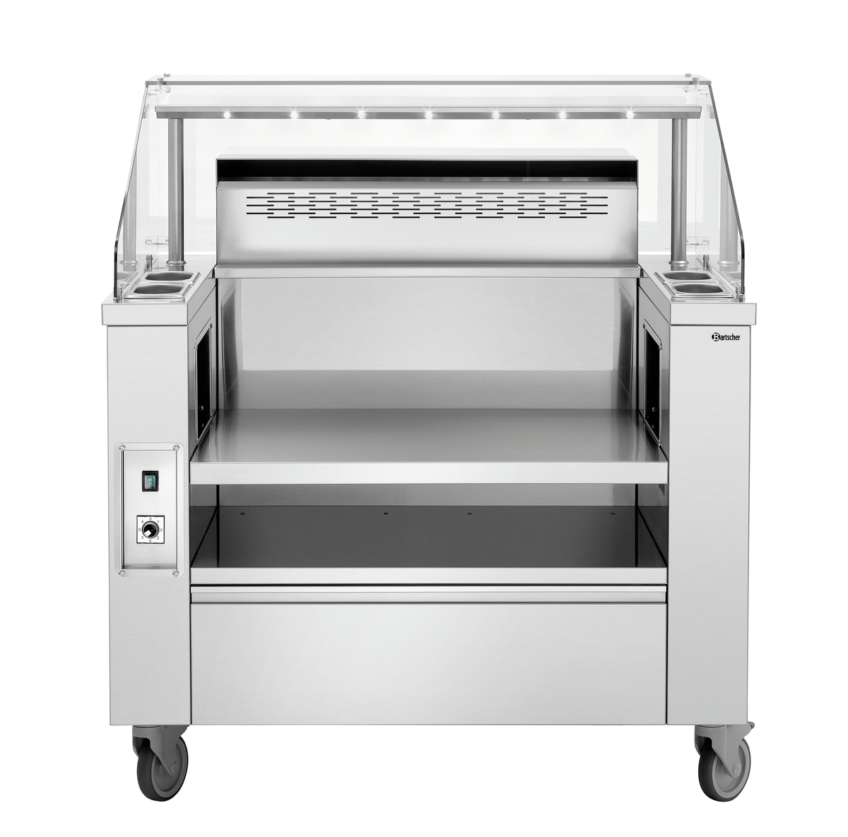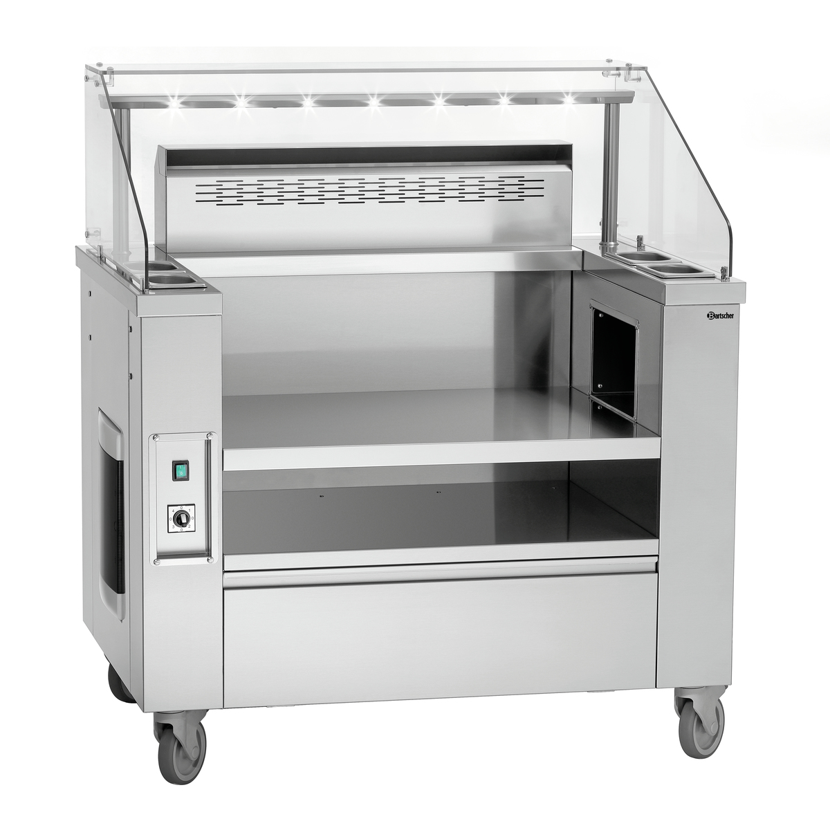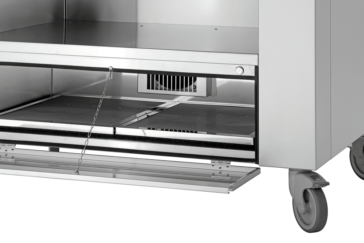 Mobile Kochstation für einen professionellen Auftritt im Front-Cooking-Bereich. Vom Induktionskocher mit 230 V bis hin zur soliden Griddleplatte der Serie 650 mit 400 V – Mit bis zu 2 Auftischgeräten extrem flexibel im Catering-, Event- und Front-Cooking-Bereich einsetzbar.