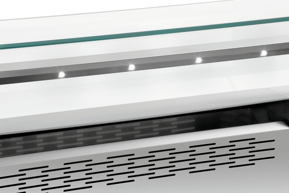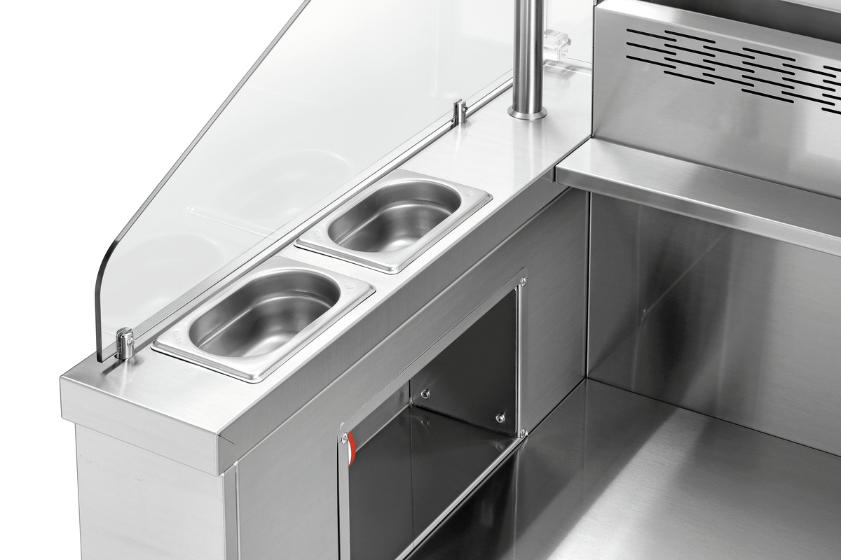 Ausgestattet mit | 4 GN-Behältern 1/9 GN, 100 mm tief für Öle, Soßen, Kochbesteck ,Ablagefach unterhalb der Einstellnischen, Maße: B 805 x T 600 x H 150 mm ,Integrierte elektrische Absicherung ,Integrierte Lüftung mit Flammschutzfilter |