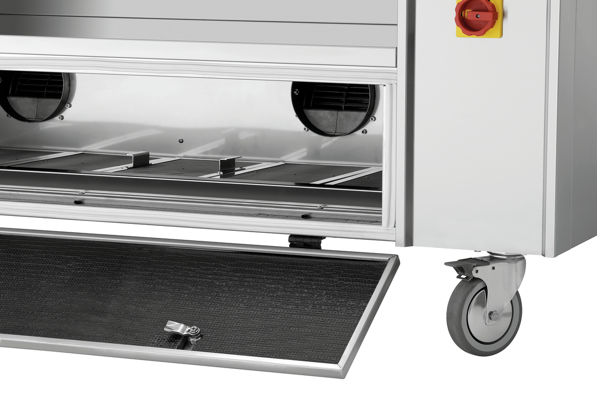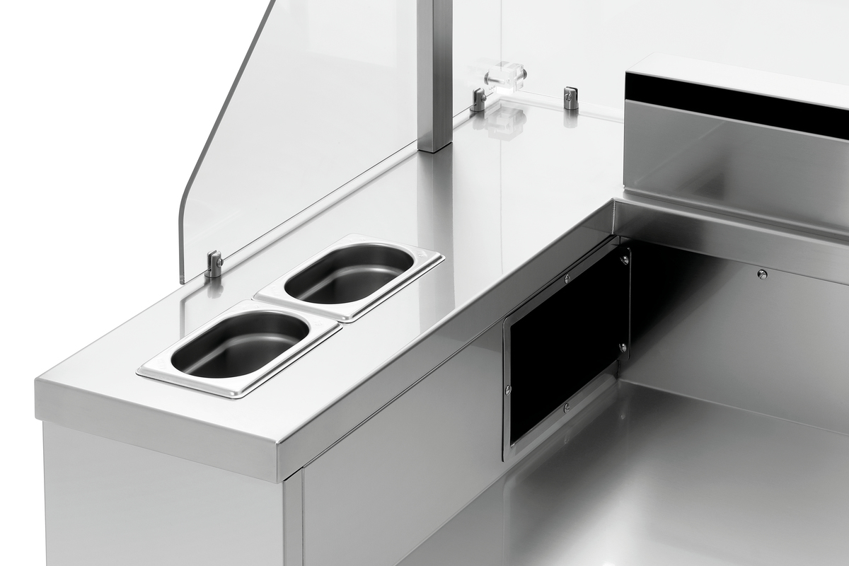 Ausgestattet mit | 4 GN-Behältern 1/9 GN, 100 mm tief für Öle, Soßen, Kochbesteck ,Ablagefach unterhalb der Einstellnischen, Maße: B 1.180 x T 455 x H 221 mm ,Integrierte elektrische Absicherung ,Integrierte Lüftung mit Flammschutzfilter |