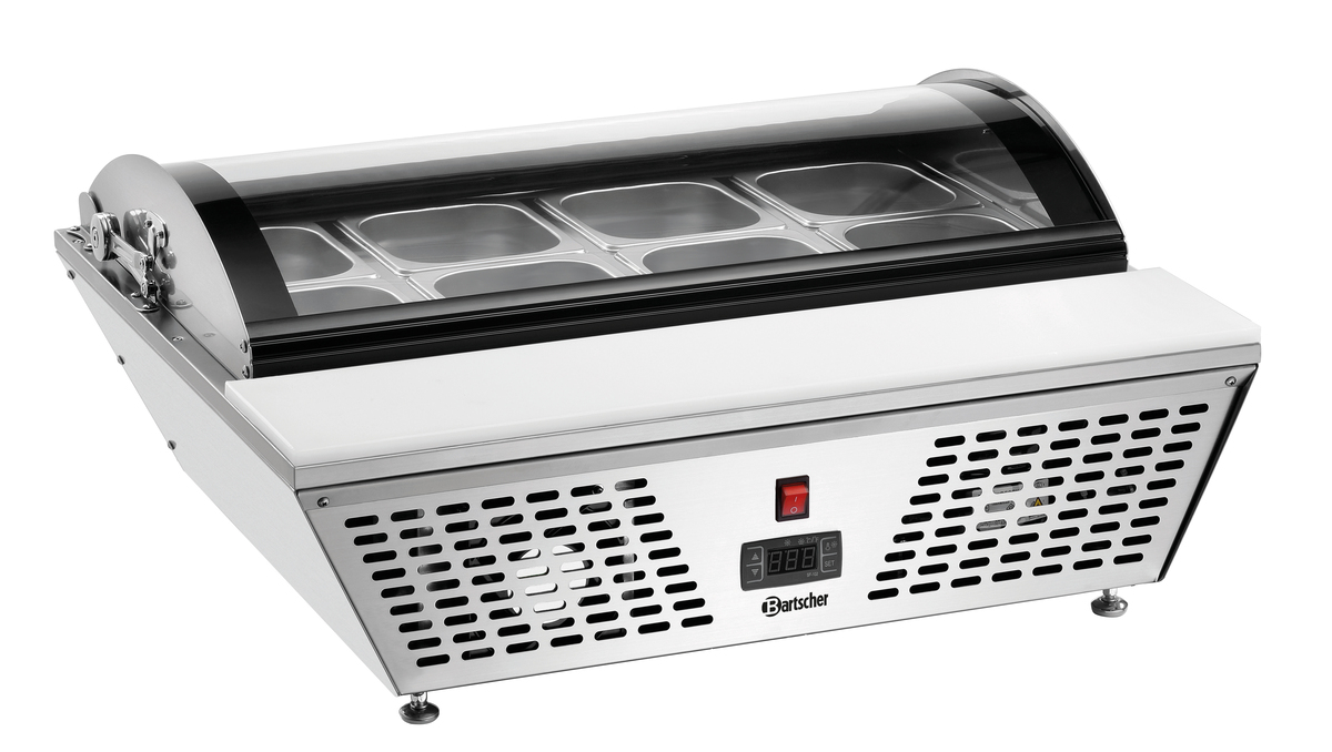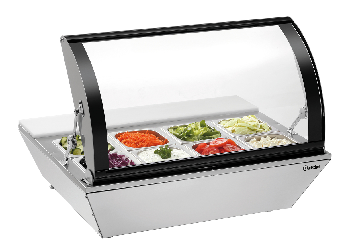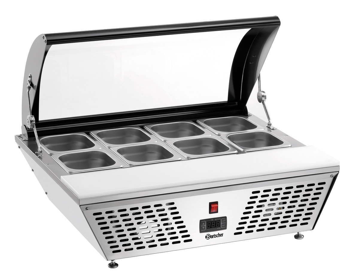 Die Kühlvititrine mit praktischem Schneidbrett fasst 8 GN-Behälter im Format 1/6 GN und ist als Auftischgerät flexibel einsetzbar. Der Deckel aus Sicherheitsglas ist nicht nur robust, sondern auch besonders praktisch: direkte Sicht auf die Speisen und bequemer Zugriff für die Speisenausgabe und -entnahme.