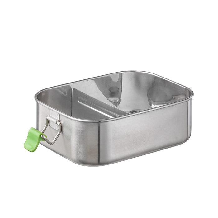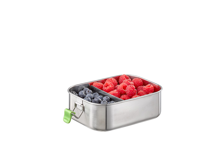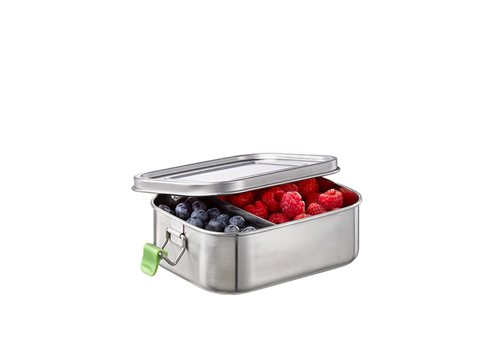 18/8 Edelstahl, innen poliert, außen mattiert, mit Silikondichtung, mit 2 Verschlüssen aus ABS, herausnehmbarer Trennsteg, 0,8 Liter