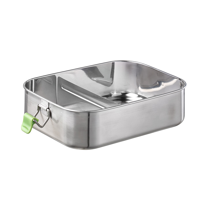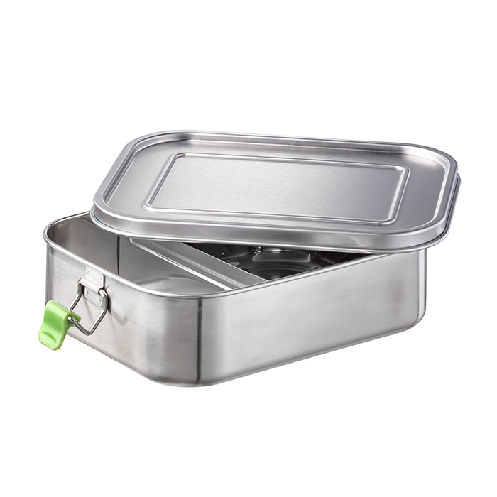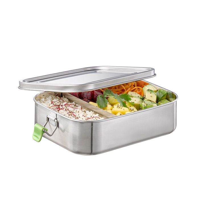 18/8 Edelstahl, innen poliert, außen mattiert, mit Silikondichtung, mit 2 Verschlüssen aus ABS, herausnehmbarer Trennsteg, 1,4 Liter