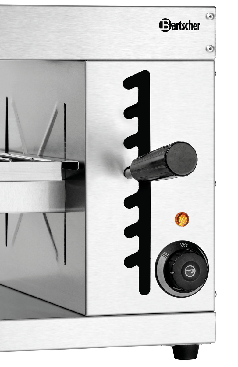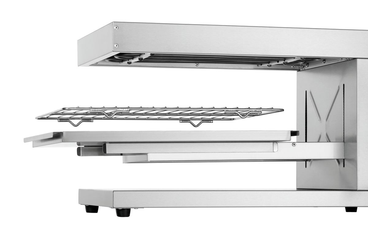 Gratinieren, überbacken und warmhalten direkt am Pass für einen fließenden Arbeitsablauf. Bei einer Platzierung auf einem Arbeitstisch bieten die beiden langen offenen Seiten des Salamanders eine praktische beidseitige Bedienung innerhalb der Küche oder zum Servicebereich.