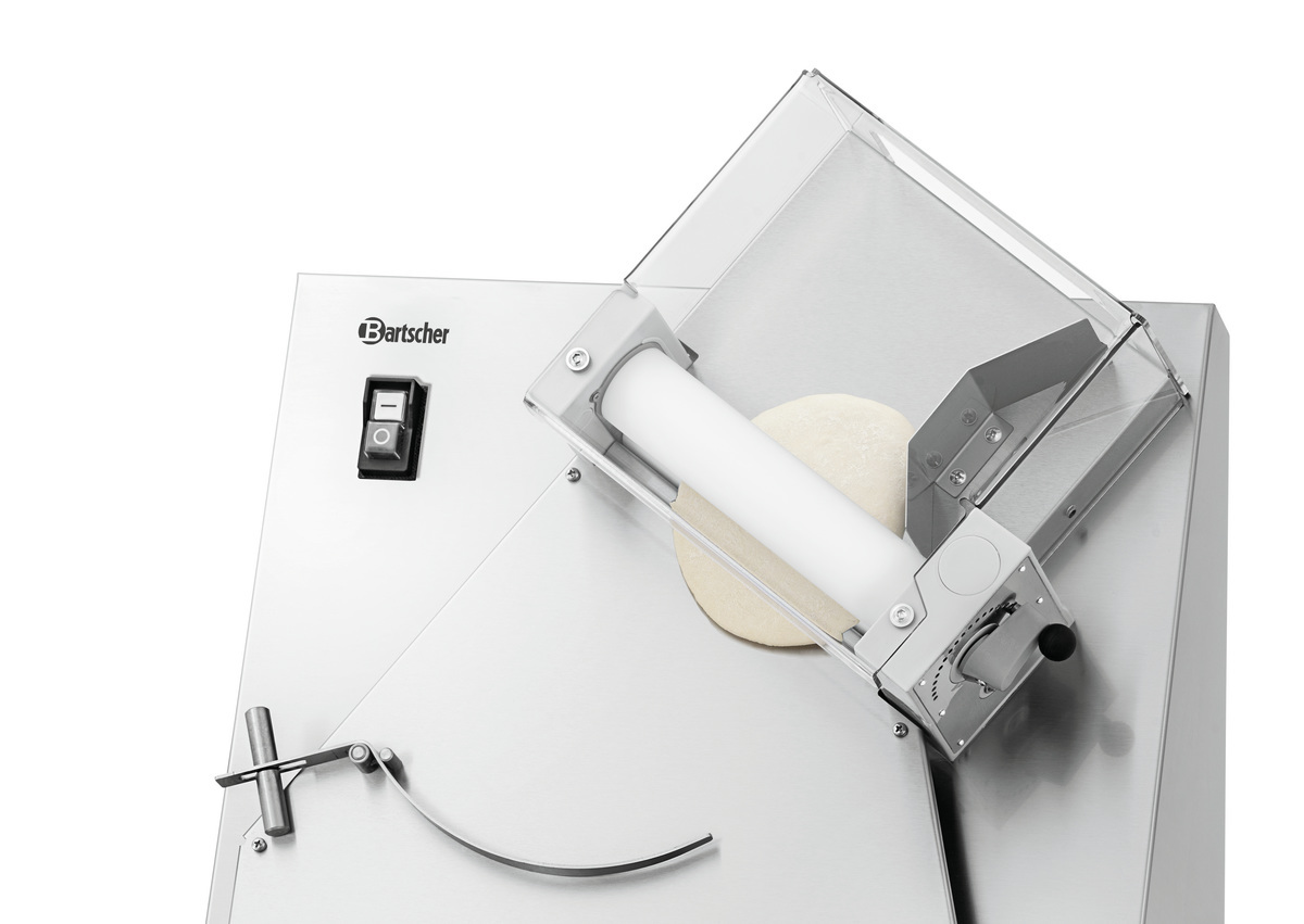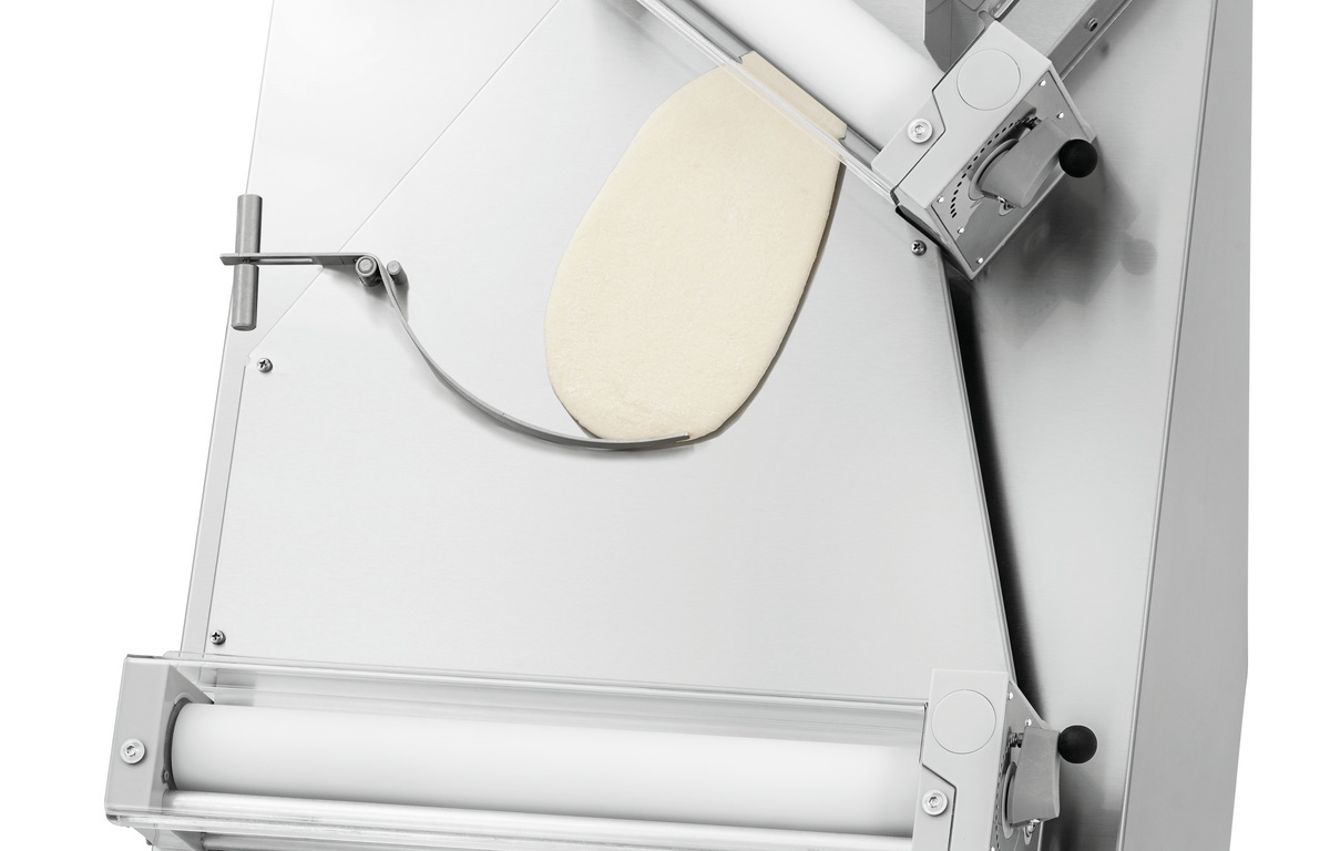 Für ein perfektes Ergebnis bei minimalem Arbeits- und Zeitaufwand – mit der Teigausrollmaschine gelingen Teige mit einem Durchmesser von bis zu 300 mm im Handumdrehen. Die vielseitige Produktion von Flammkuchen-, über Pizza- bis hin zu Fladenbrotteig ist ganz einfach über die Teigstärkeneinstellung der beiden Teigrollen möglich.
